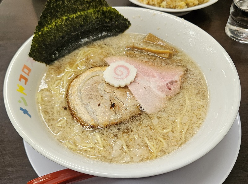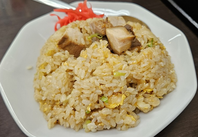 背脂無料なのでお願いしました。値上がりがえげつないですが、それでもこの内容で納得。ラーメンはレアチャーシューとバラ肉チャーシュー2枚、しかも大きい。スープは醤油か塩が選べますが、今回は背脂を入れたかったので醤油にしました。相変わらず美味しいですね。炒飯のボリュームも凄いですが、これが相当旨い!真ん中にコロチャーがゴロゴロ。