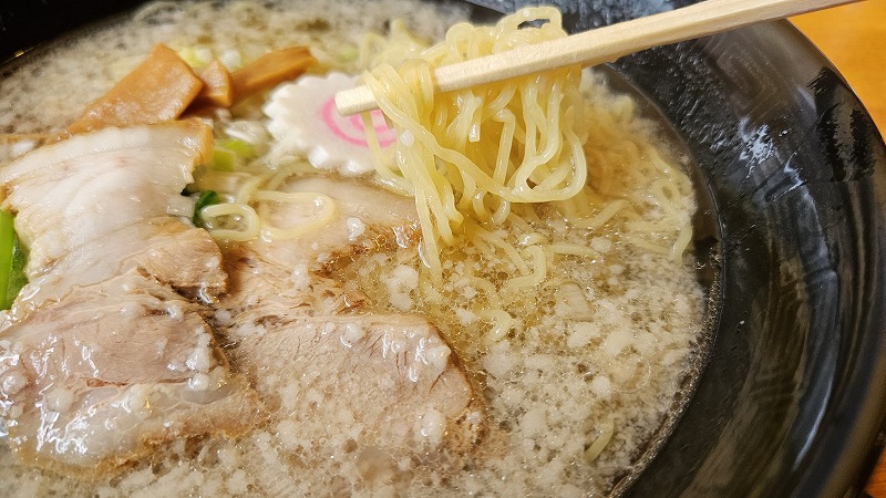麺はプリンとした食感の細麺。啜り感がいいですね。スープは少しショッ辛い澄んだスープ。背脂がこってり感を加えます。チャーシューは脂身がしっかりあって味付けも強め。美味しいですね。