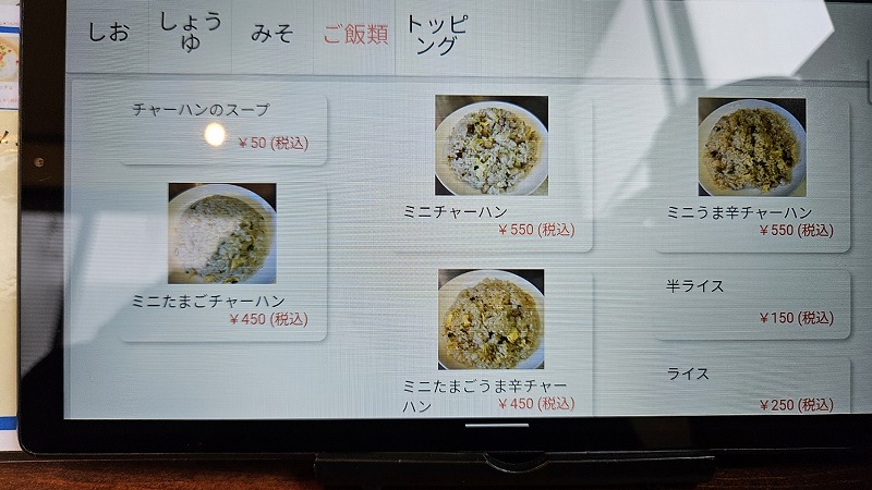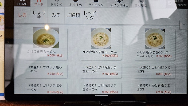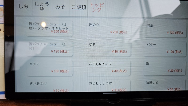 注文はタブレット式。素ラーメンなどがあり、トッピングでカスタムしていくスタイルのようです。