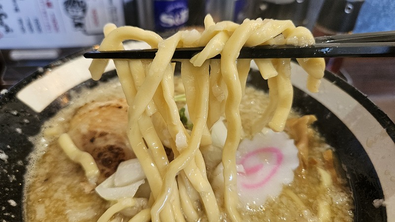 麺は醤油と同じく太麺で、これがなんとも言えない食感!食べごたえもあり、啜り感も楽しめます。
