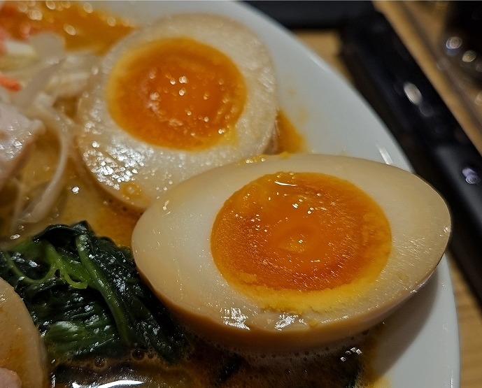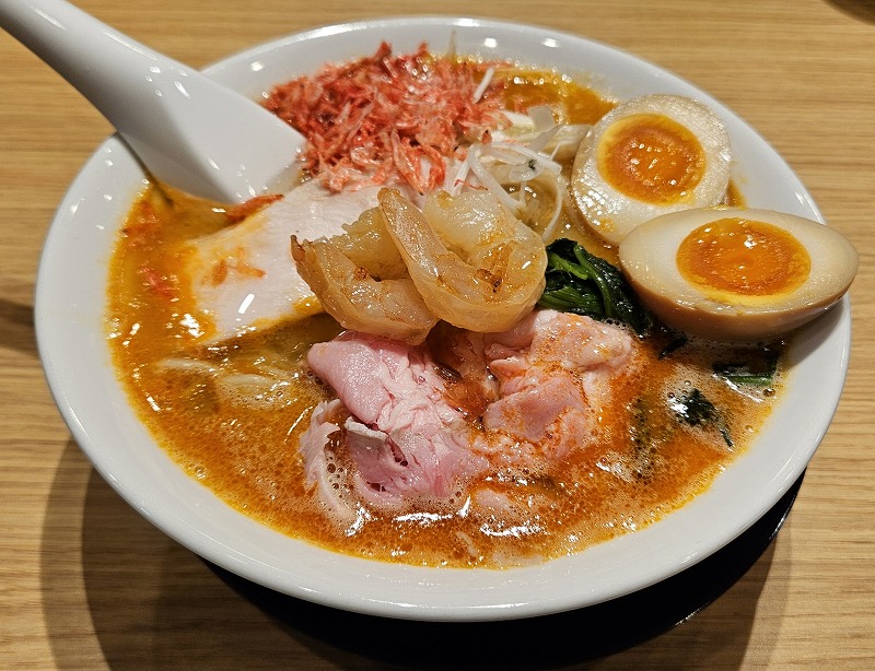 とにかく具沢山!プリンプリンの海老は2個!そしてレアチャーシューと鶏チャーシュー、味玉まで入ってます!小エビもスープ1面に降り注いでますね。