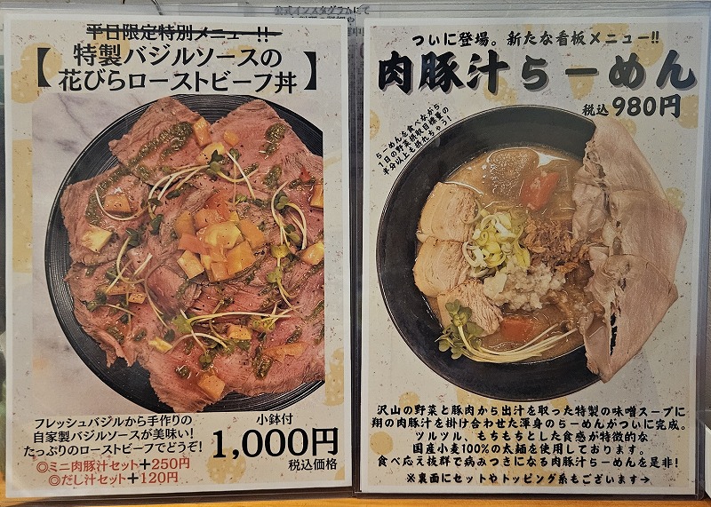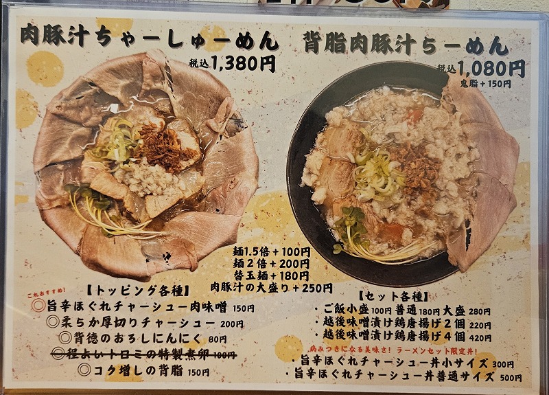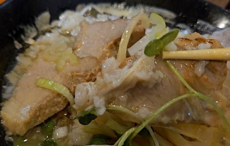 肉豚汁 翔「新潟市中央区」で、背脂の入った豚汁ラーメンを頂きました! 投稿者 しばっち投稿日:2025年12月3日2025年12月9日 新潟市中央区、肉豚汁 翔に行ってきました。 メニュー 背脂肉豚汁らーめん1080円 麺は太麺。モッチリとしたコシの麺です。 スープは豚汁ですが、背脂のおかげでラーメンらしくなっています。赤味噌っぽい少しトガリのある印象。 チャーシューは2種類。赤身のしっかりしたものと、薄切りされたチャーシューです。 悪くないですね。この内容で値段が安いですね。 翔 関連ランキング:丼(どんぶり) | 上所駅、白山駅、新潟駅