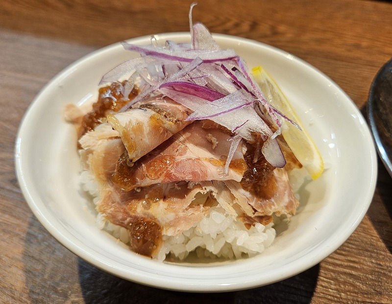 レアチャーシューは言うことなしの旨さ。そしてそれを引き立てるソースは、ジュレ状になっていてこれが飯を侵さずレアチャーシューに旨味を加える優れもの。技ありですね。