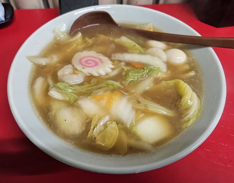 熱々の餡掛けが寒い日には染みますね。それもそのはず、ここは外だからwクロレラ麺は意外と優秀で、モチッとした食感が良いですね。白菜たっぷり目、魚介類少なめ。ウズラ卵は2個。少し割高感がありますが、話題性のある面白いお店でした。