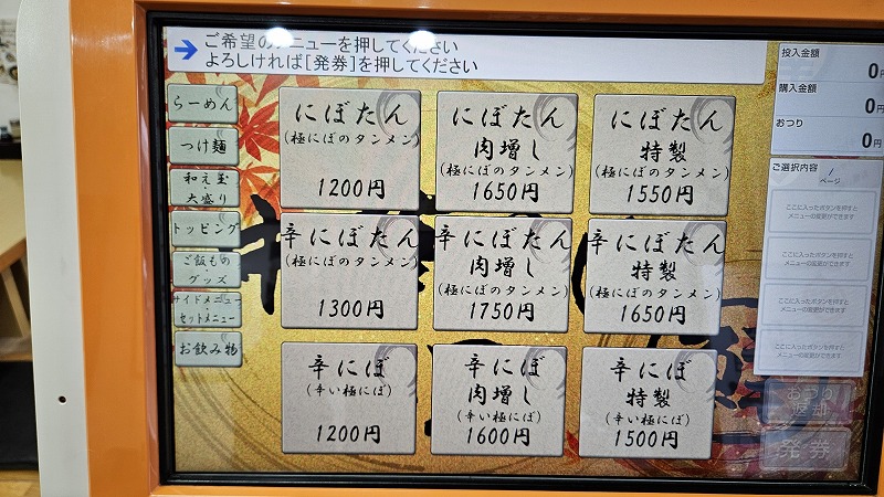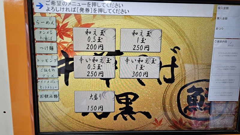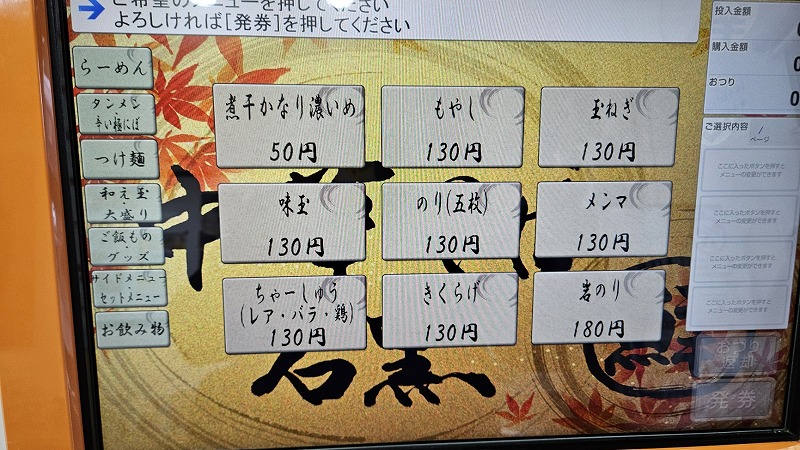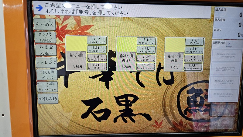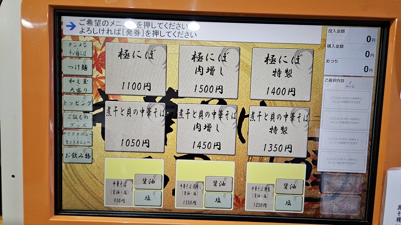 タッチパネル式食券制です。今回のコラボつけ麺を注文する際は現金を店員さんに渡して口頭で注文します。