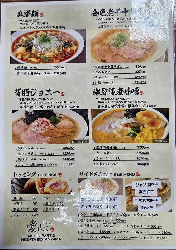 愛心Part2「新潟市東区」で、麻婆麺を食べてきました! 投稿者 しばっち投稿日:2026年1月8日2025年12月21日 新潟市東区の愛心PART2に行ってきました。10時半開店のありがたいお店です。 メニュー 麻婆麺1000円 辛さはだいぶ控えめ。本店の麻婆は辛かった記憶ですが、こちらはおとなしめですね。 麺は細麺。となりの客が太麺に変更していましたが、これは細麺の方が美味しいと思いますね。 人気なのも頷けます。わりと庶民的な麻婆麺で、だれからも愛されそうです。 麺屋 愛心 関連ランキング:ラーメン | 東新潟駅