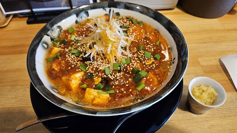 豆腐は衣を纏っています。これは珍しい。いわゆる「揚げ出し豆腐」ですね。サクサクとまではいきませんが、餡が豆腐によく絡む。これは触感的にも味的にも好きですね。生姜がしっかりと効いており、後入れの生姜オイルも付いてきます。生姜オイルを追加するとかなり辛くなります。