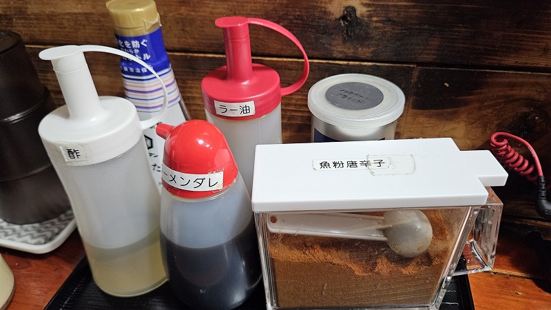 卓上の魚粉唐辛子がかなり優秀な味変アイテム。辛さだけでなく旨さも広がります。