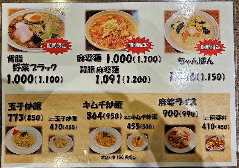 やっぱりラーメンとミニ炒飯で1100円くらいがありがたいです。