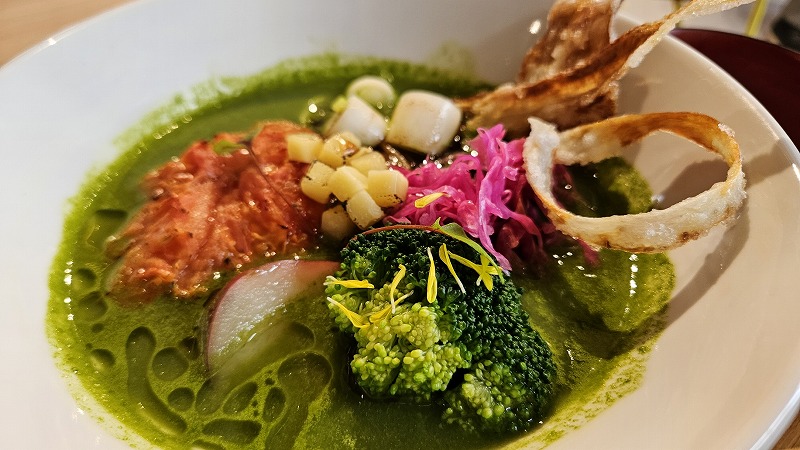 動物系を一切使っていないとのことですが、これは凄いラーメンですね。豆乳ベースのスープは、しっかりとコンソメ系の旨味を感じます。緑色はほうれん草のようです。具材は揚げ牛蒡、ブロッコリー、トマト、サツマイモ、葱、ニンニク、護摩堂野菜という田上の野菜を使っているそうで、野菜嫌いな自分でも素材の旨さに感動すら覚えました。麺も良いですね。スープに良くあっています。量も中々です。10円ライスを残ったスープに投入すれば、最高のリゾットが出来上がります。これは美味しかった!