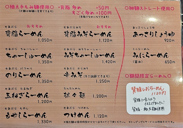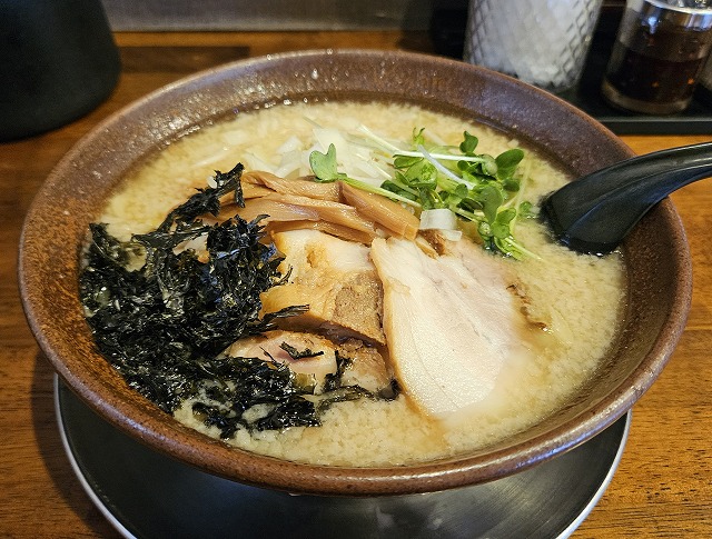らーめん家りりん「長岡市」さすがの背脂味噌! 投稿者 しばっち投稿日:2026年3月23日2026年3月15日 長岡市のらーめん家りりんに行ってきました。 メニュー 背脂みそらーめん1120円 スープは白味噌ベースの優しさ重視。背脂も相まって更に円やか。エッジの効いた感じはあまりなく、とにかく優しくて馴染みの持てるスープですね。麺は超極太。茹で時間かかってましたね。でも我慢した甲斐もあります。どこでも感じられない図太い食感が病み付きになりそう。チャーシューも脂身が美味しいし、岩海苔の磯感も感じられ、大満足の一杯でしたね。 らーめん家 りりん 関連ランキング:ラーメン | 来迎寺駅